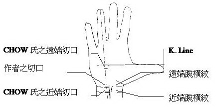 採用雙入口術式者,以南依利諾州大學的Dr. CHOW為代表 。這種術式除了腕側的切口外,另外在手掌中心作另一切口,方法是先找到CARDINAL LINE和無名指正中線的交叉點,再往腕部退回一公分處,即是第二切口的位置。雙入口術式的腕部切口位置,與採行單入口術式時,也略有不同。採行雙入口術式時,因為內視鏡與刀子須同時分別自兩切口進出,兩切口的路徑有必要盡量呈一直線,因此,手腕要保持高度背屈的姿勢,同時,腕部切口須盡量靠近近端腕橫紋(proximal wrist crease)才好作。