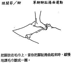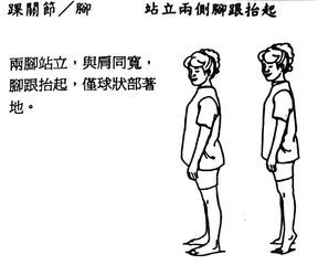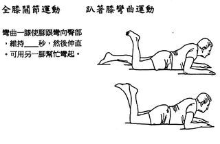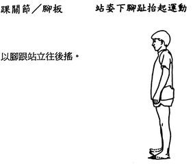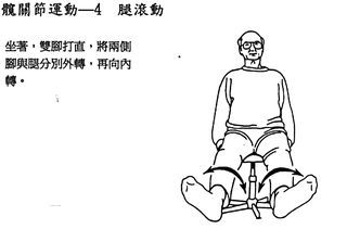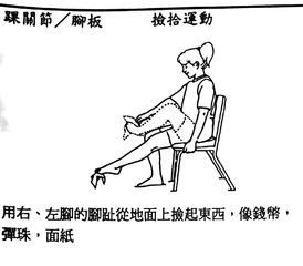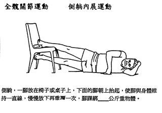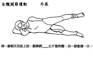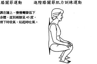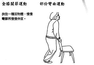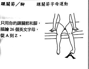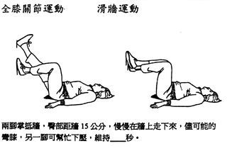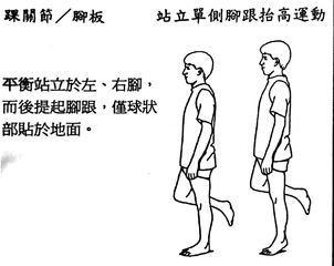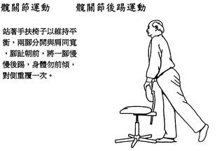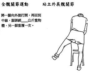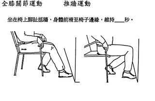 以上圖片是下肢三大主要關節的訓練方法,若是換成在站立的姿勢下執行,難度就會增加,可利用椅子來幫忙維持穩定,避免跌倒危險。利用空閒的時候在家中執行,或是上班族在辦公室內,也能從中挑選較易執行的動作來訓練。
