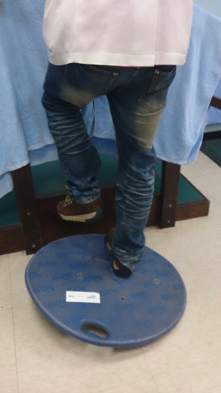 沿著板緣旋轉,這個動作可以牽拉腳踝周邊的軟組織,因為單腳承重可以增進踝關節本體腳,在坐旋轉動作時腳踝肌肉必須有精細的操作,可增進肌力。
