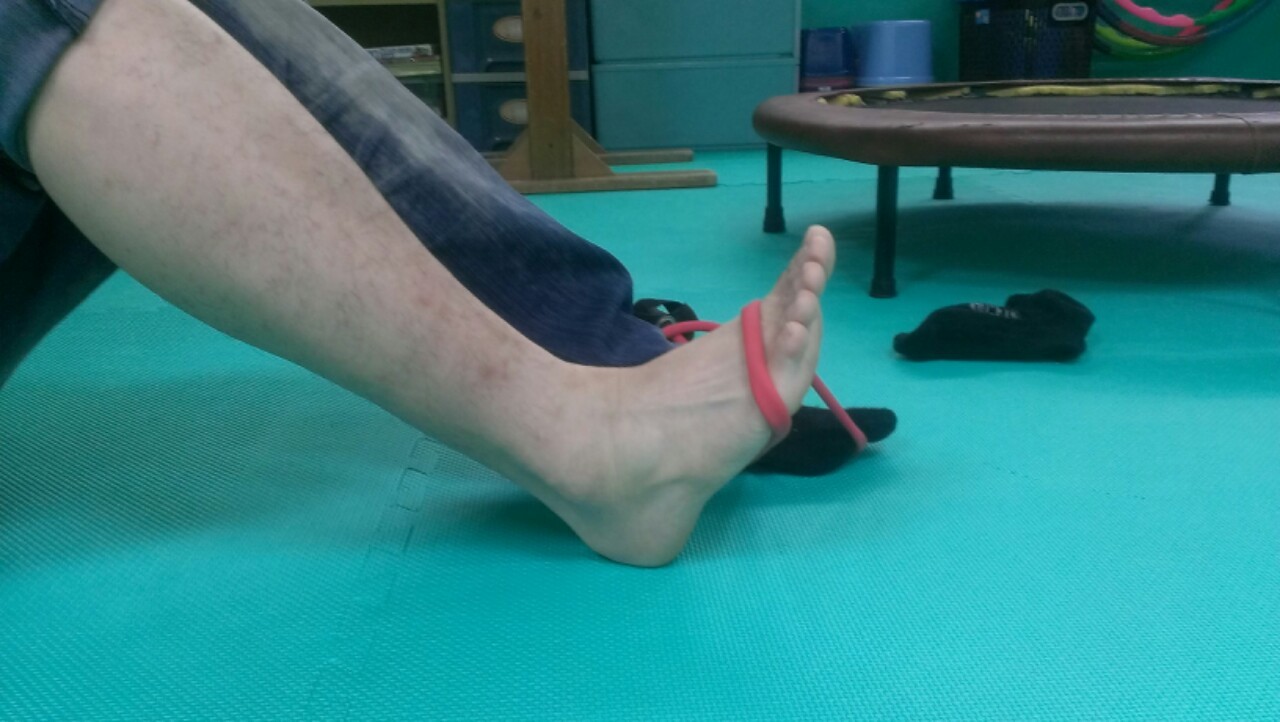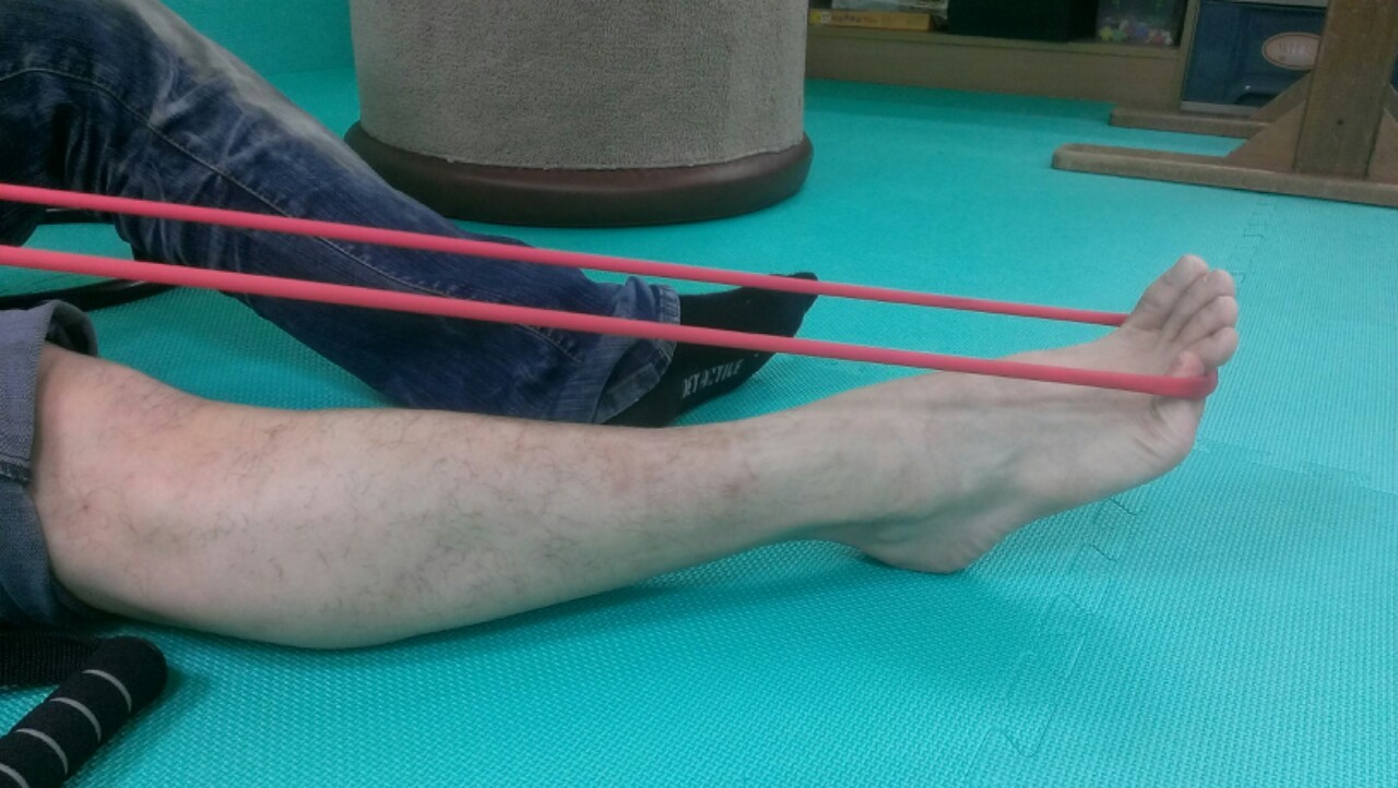 增加整著小腿的肌力,分別做腳踝下壓與腳踝抬起的動作。每個動作各停十秒,10回。