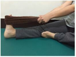 平坐在地上或床上,毛巾越過腳底板放在前緣上,向身體方向牽拉,覺得有緊繃感時停住維持10-20秒,一回10次,一次3回。