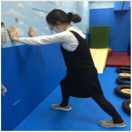 雙手平貼於牆面上,雙腳一前一後站立,兩腳腳底板平貼於地面上,腳尖朝,前,兩眼直視於正前方,向下半蹲,停留10-20秒,一回10-20下,一天3回。