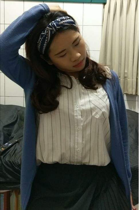 上斜方肌 (upper trapezius):以伸展左側上斜方肌為例,左手抓椅角不可聳肩,右手將頭往右側彎,加上頭往左下角旋轉的動作,感覺到微緊繃時停留 。(見圖四)