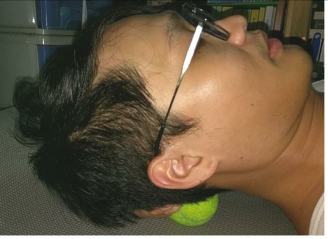 躺姿,將小球置於枕骨下肌位置(手協助固定小球),給予壓迫,維持30秒。(見圖十一)