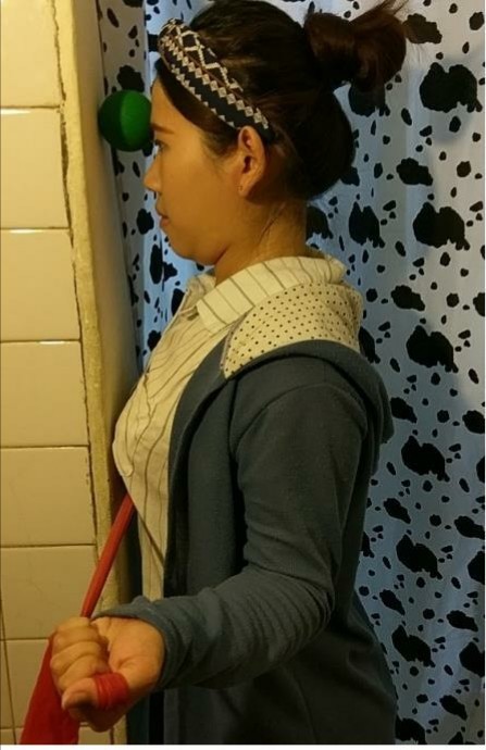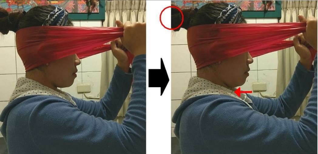 站/坐姿,雙手握有彈性的帶子(或繩子)維持不動,彈性帶(或繩子)的方向須與地面平行,做出縮下巴的動作。