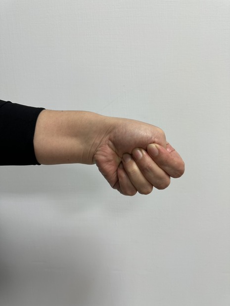 將患側手手肘彎曲,拇指朝上。另一手覆蓋患側手的虎口,拇指壓著患側手的掌骨,牽伸肌腱,會感覺到患處肌腱被拉扯,持續約5-10秒。重複10次。