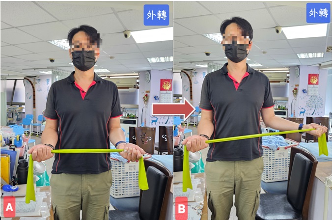 ①慢慢的做出外轉動作,感覺肩膀後側用力
