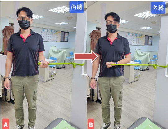 ①慢慢的做出內轉動作,感覺肩膀前側用力