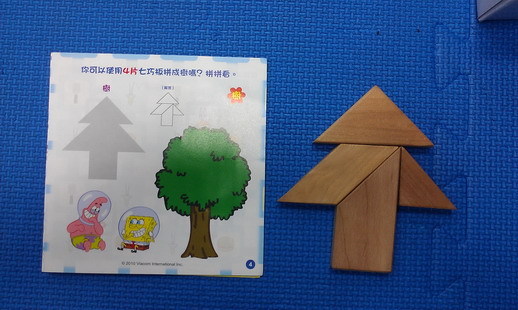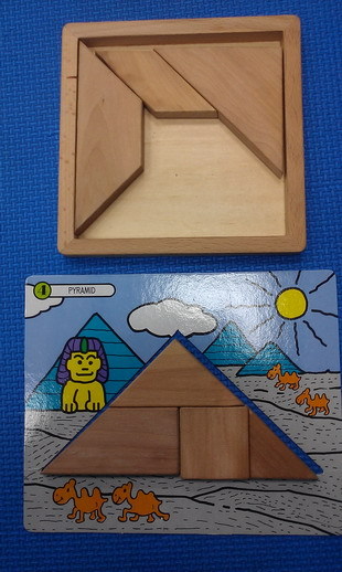 平日多讓孩子進行拼圖、七巧板、六面立體拼圖等活動,活動方式:將底圖放置於框內,依照底圖片翻轉積木去配對目標底圖正確相符合的位置圖案,加強視覺搜尋、對照概念並訓練空間分割配置及方位的概念,活動可增加難度將圖片移出框外。