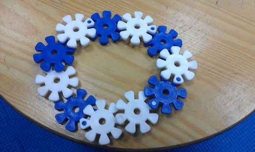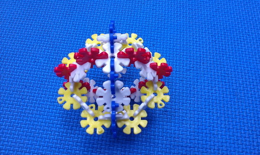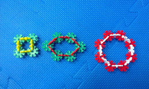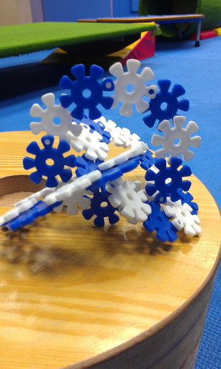 仿疊積木樂高或花片、模型拼組仿拼,活動進行方式:家長可以先從簡單的幾何圖形拼接開始訓練,一方面可以加強形狀辨識,亦可透過圖形切割成小單位(如:3個相連的花片為一個套組)訓練孩子去判斷目標仿拼圖形的空間分割、相鄰的花片或積木的配置及方位,活動進行可以利用雙色交錯來增加視覺提示,也可以透過口語提示要求計算的幾個空格要接合,困難度可以逐漸增加為3D立體圖形或是按照平面圖示或分解的步驟仿拼出作品,促進孩子對圖片及物品本身與其他物品的空間關係判斷。