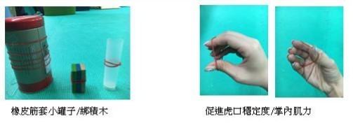 透過使用橡皮筋來促進手弓發展及虎口的穩定度,同時也利用橡皮筋的阻力來增進手部小肌肉的肌力與肌耐力。
