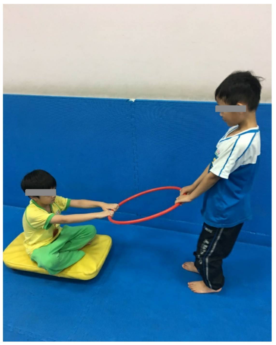在團體互動課上,讓孩子主動邀請隊友,藉由需要合作的遊戲,讓孩子們練習互相協助與溝通。