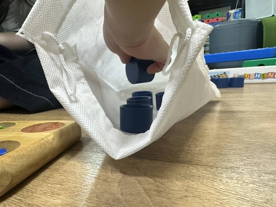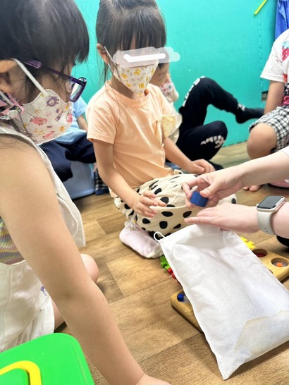 用不同材質的觸覺配對板,加上簡易的顏色路徑,讓小朋友從袋子裡