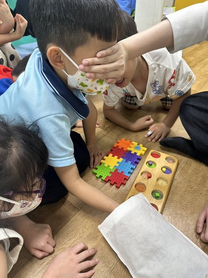 摸出相對應的材質圓板後前進,練習專注力、記憶力、觸覺辨識,增